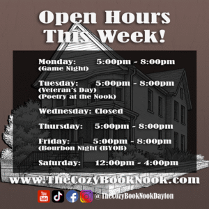 1400 E. 3rd St. Dayton, OH 45403 Join Our Newsletter!!> Email address: Leave this field empty if you're human: When you join our Newsletter, you also become a Free Member! Upcoming Events Upcoming Events Nov 22 12:00 pm - 4:00 pm Grand Opening!!! Nov 29 12:00 pm - 6:00 pm Small Shop Saturday in the Historic Inner East Dec 5 6:00 pm - 8:00 pm December Book Club View Calendar Books! Books! Books! November Traditional Book Club Audio Books New Books Contact UsEmail: contactus@thecozybooknook.comPhone: 937-530-0720