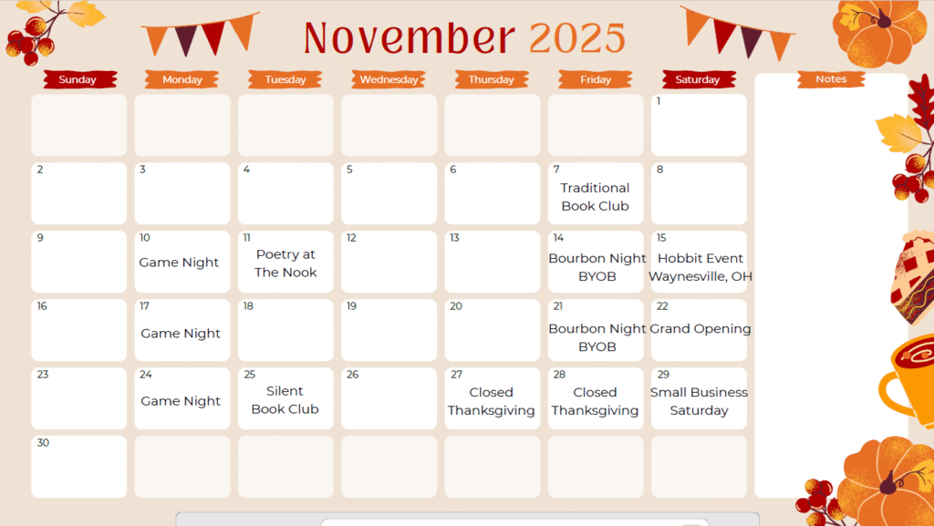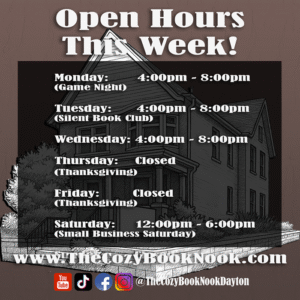 1400 E. 3rd St. Dayton, OH 45403 Join Our Newsletter!!> Email address: Leave this field empty if you're human: When you join our Newsletter, you also become a Free Member! Upcoming Events Upcoming Events Nov 29 12:00 pm - 6:00 pm Small Shop Saturday in the Historic Inner East Dec 5 6:00 pm - 8:00 pm December Book Club Dec 19 6:00 pm - 8:00 pm December Indie Book Club View Calendar Books! Books! Books! November Traditional Book Club Audio Books New Books Contact UsEmail: contactus@thecozybooknook.comPhone: 937-530-0720