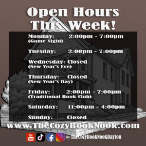 1400 E. 3rd St. Dayton, OH 45403 Join Our Newsletter!!> Email address: Leave this field empty if you're human: When you join our Newsletter, you also become a Free Member! Upcoming Events Upcoming Events Jan 24 12:00 pm - 4:00 pm Vendor Village at the Nook! Jan 24 6:00 pm - 7:00 pm The Cozies! Feb 6 6:00 pm - 8:00 pm February Traditional Book Club View Calendar Books! Books! Books! Audio Books New Books Contact UsEmail: contactus@thecozybooknook.comPhone: 937-530-0720