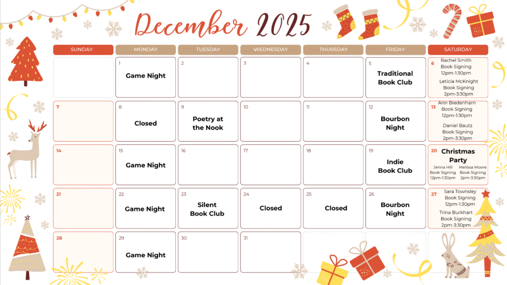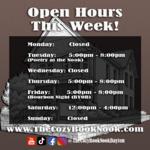 1400 E. 3rd St. Dayton, OH 45403 Join Our Newsletter!!> Email address: Leave this field empty if you're human: When you join our Newsletter, you also become a Free Member! Upcoming Events Upcoming Events Dec 19 6:00 pm - 8:00 pm December Indie Book Club View Calendar Books! Books! Books! November Traditional Book Club Audio Books New Books Contact UsEmail: contactus@thecozybooknook.comPhone: 937-530-0720