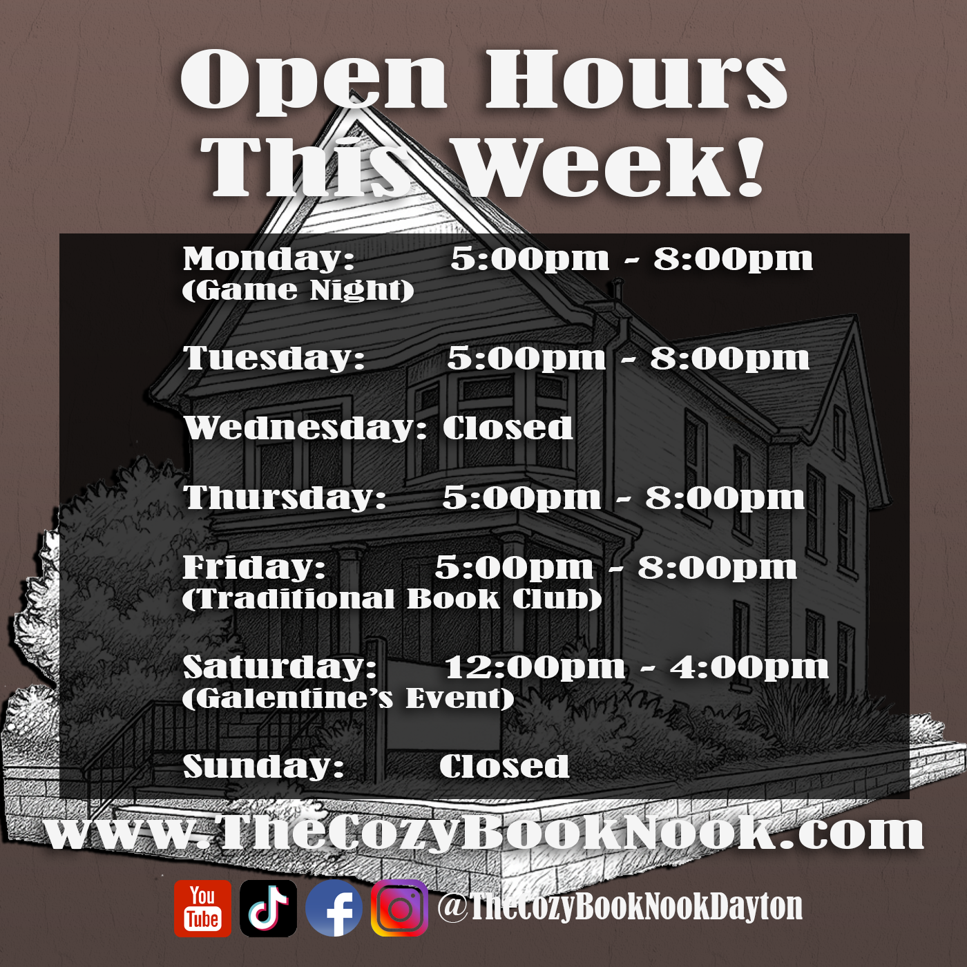 1400 E. 3rd St. Dayton, OH 45403 Join Our Newsletter!!> Email address: Leave this field empty if you're human: When you join our Newsletter, you also become a Free Member! Upcoming Events Upcoming Events Feb 6 6:00 pm - 8:00 pm February Traditional Book Club Feb 7 12:00 pm - 4:00 pm Galentine’s Book Bedazzling Brunch! Feb 10 6:00 pm - 8:00 pm February Poetry Mixer! View Calendar Books! Books! Books! Audio Books New Books Contact UsEmail: contactus@thecozybooknook.comPhone: 937-530-0720