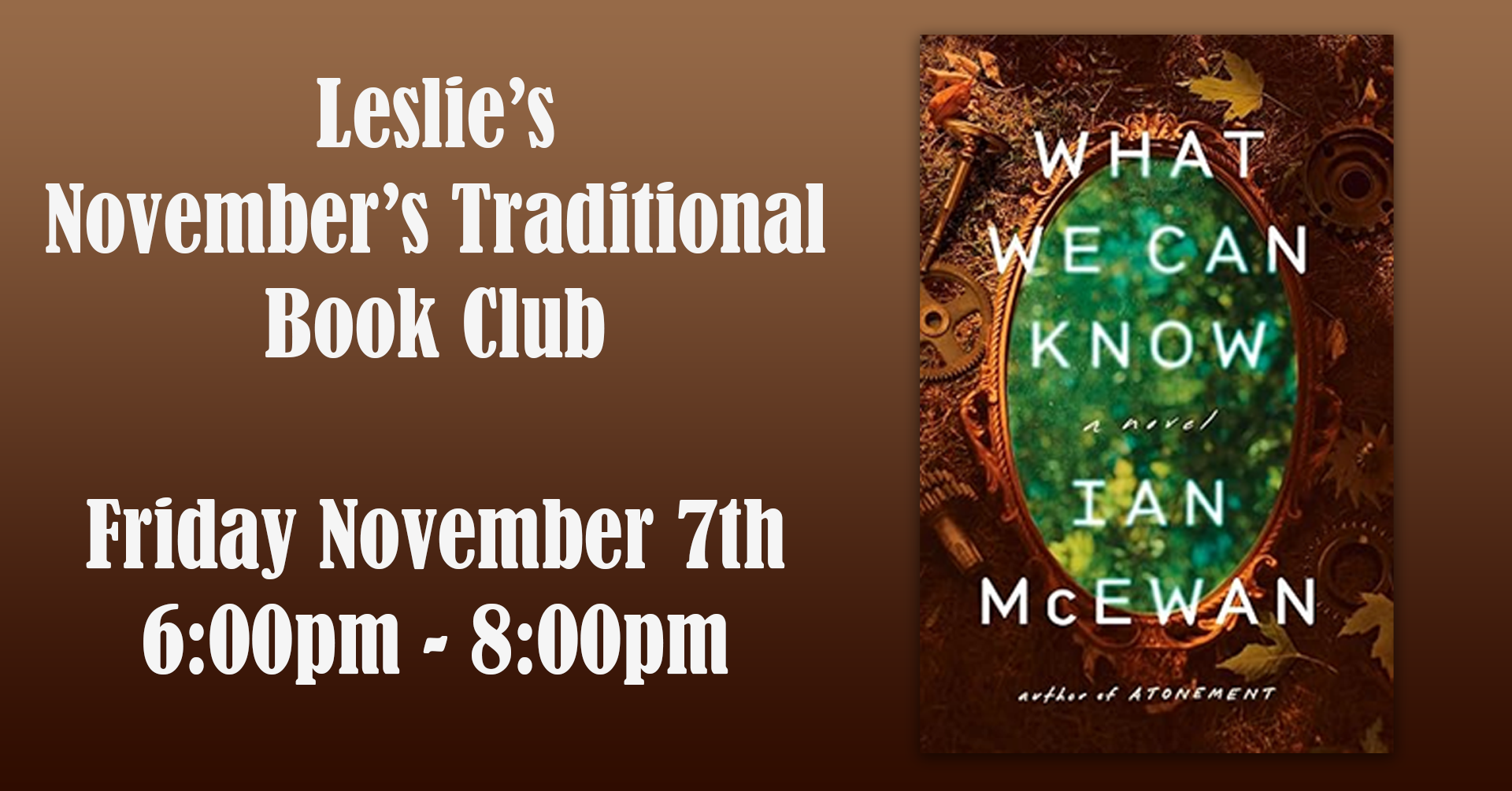 Join us November 7th for our monthly Traditional Book Club as we discuss "What We Can Know" by Ian McEwan!