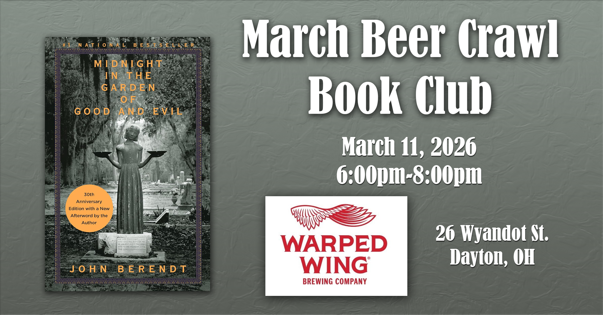 Join us Wednesday March 11, 2026 6pm-8pm at Warped Wing in Downtown Dayton as we discuss "Midnight in the Garden